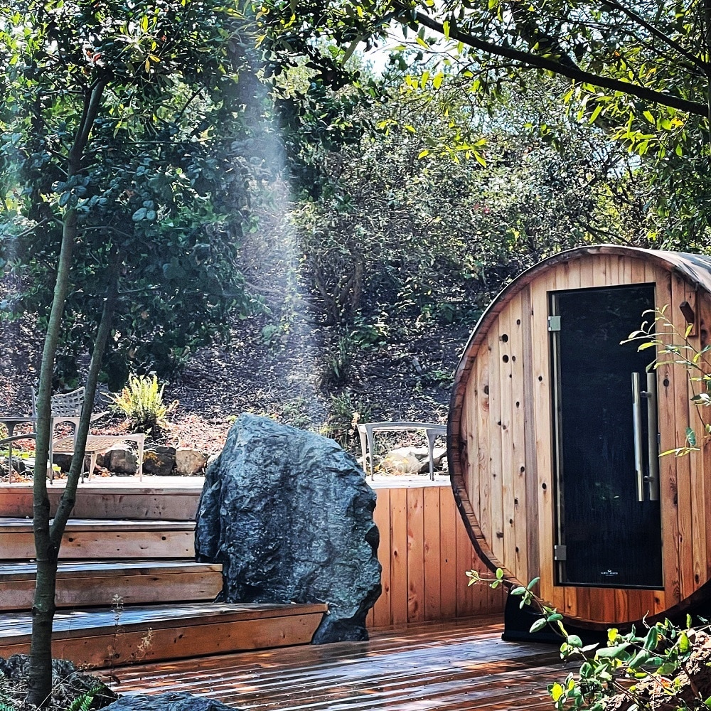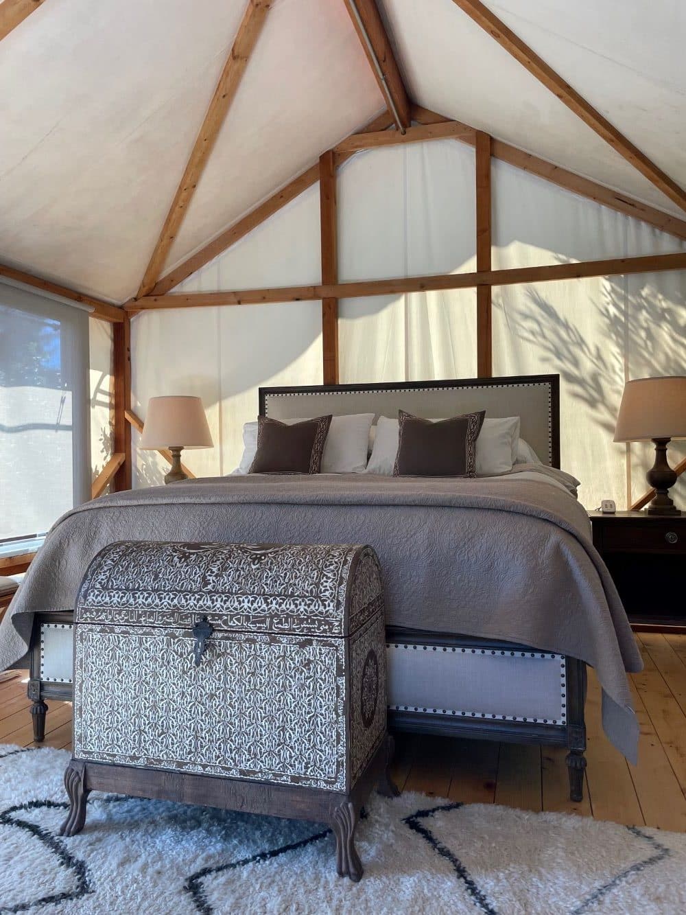 For guests, the property provides four comfortable safari tent cabins complete with detached bathroom, shower/tub rooms, and a private outdoor shower, sauna and cold plunge tub and bocce ball court.