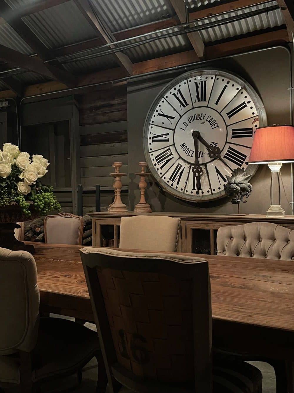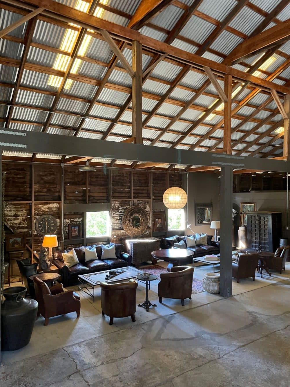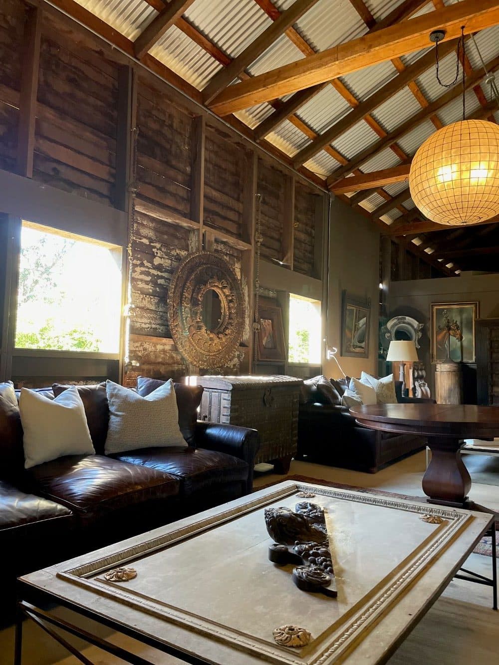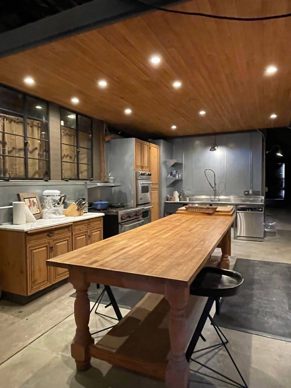 A beautifully restored 120-year-old historic barn features a commercial kitchen along with a bathroom and shower room. The 4000+-sq ft space has a spacious dining area, anchored by a custom table, creating an inviting setting for gatherings, while the cozy lounge space offers sofas and comfortable seating for post-dinner relaxation.